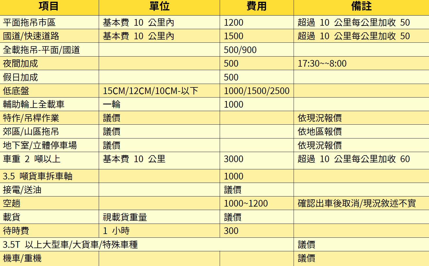 24小時道路拖吊救援、急修、特殊作業、 快速出車、專人解說報價 立即來電:0910-667082 任何故障地點車況 / 大小車型 / 機械運送 / 吊桿作業 / 機車 都可詢問 價目表 備註:此報價僅供參考實際價格可能因優惠/作業難度/作業地點有所差異 附表:國道/快速道路小型車拖救基本費率 單位:新台幣 備註: 一、大型重型機車比照底盤高度≧15 公分小型車,並依新車價值收基本費,現場作業費或待時費另計。 二、國道5 號雪山隧道內故障車輛加收1,500 元。 三、拖救作業衍生之任何問題,由拖救車及拖車司機負責。 立即來電:0910-667082 價格透明 / 出車迅速 / 歡迎致電詢問